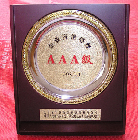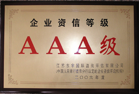 近日,公司再次獲得江蘇東宇國際咨詢評(píng)估有限公司授予的AAA級(jí)企業(yè)資信等級(jí)銅牌,該機(jī)構(gòu)是中國人民銀行南京分行認(rèn)定的企業(yè)資信評(píng)級(jí)機(jī)構(gòu),這已經(jīng)是集團(tuán)公司自2003年以來連續(xù)4次獲得了。