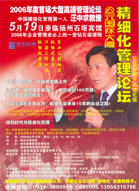 由公元國際大廈獨(dú)家冠名的2006年度首場大型高端管理論壇精細(xì)化管理論壇將于5月19日在石塔賓館隆重舉行。中國精細(xì)化管理第一人汪中求教授將親臨現(xiàn)場為企業(yè)管理者講授一次鉆石級課程。公元國際大廈作為甲級寫字樓為業(yè)主提供了高品質(zhì)的創(chuàng)業(yè)平臺,精細(xì)化管理則是每一個現(xiàn)代企業(yè)所倡導(dǎo)的管理理念,是未來十年的必經(jīng)之路。據(jù)悉,凡公元國際大廈業(yè)主均可獲贈價值888元門票一張和汪中求《精細(xì)化管理》力作一本。