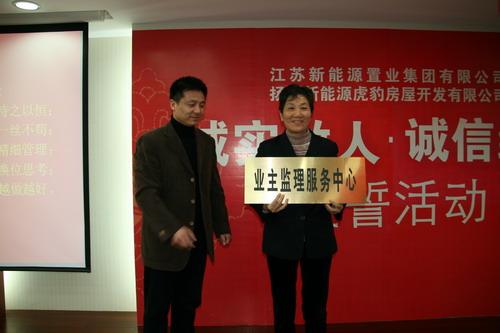 3月13日晚,江蘇新能源置業(yè)集團有限公司和揚州新能源虎豹房屋開發(fā)有限公司在3.15來臨之際,在公元國際大廈會議室隆重舉行了誠實做人、誠信經(jīng)營;宣誓活動。新能源營銷部、工程部及物管公司人員和揚州各界媒體以及眾多新能源項目的新老業(yè)主也應約參加了此次活動,30余位業(yè)主現(xiàn)場接受了新能源業(yè)主兼職工程質量 監(jiān)理員。新能源營銷部、物管公司及工程部也現(xiàn)場宣誓: