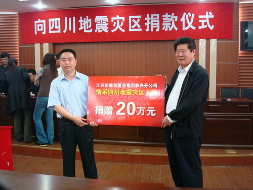 災(zāi)難無(wú)情人有情,一方有難八方支援。四川汶川發(fā)生強(qiáng)烈地震的消息傳來(lái),泰興市新能源新城市花園的開發(fā)商江蘇新能源置業(yè)集團(tuán)泰興分公司立即與泰興市政府相關(guān)部門聯(lián)系,于2008年5月15日上午10:30在泰興市政府會(huì)議室向?yàn)?zāi)區(qū)人民捐款20萬(wàn)元,以表達(dá)對(duì)災(zāi)區(qū)人民的深情關(guān)愛(ài)。