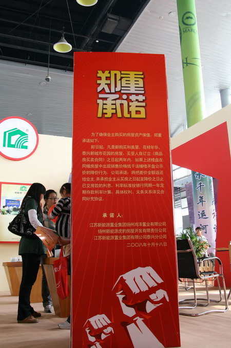 在房展會開幕式上,江蘇新能源置業(yè)集團(tuán)被授予揚(yáng)州市區(qū)優(yōu)秀房地產(chǎn)企業(yè);。同時(shí)在房展會上江蘇新能源置業(yè)集團(tuán)有限公司、江蘇新能源置業(yè)集團(tuán)有限公司泰興分公司、揚(yáng)州新能源虎豹房屋開發(fā)有限公司、揚(yáng)州鴻澤置業(yè)有限公司為了確保業(yè)主購買的房屋資產(chǎn)保值,向社會作出鄭重承諾:即日起凡是新購買和美第、花樣年華、泰興新城市花園的房屋,買受人自訂立《商品房買賣合同》之日起兩年內(nèi),如果上述樓盤在同幢房屋中出現(xiàn)銷售價(jià)格低于該幢樓開盤公示價(jià)的降價(jià)行為。公司承諾:將把差價(jià)全額返還給業(yè)主,并承擔(dān)業(yè)主從買房之日起至降價(jià)之日止已交房款的利息,利率標(biāo)準(zhǔn)按照銀行同期一年定期存款利率計(jì)算。