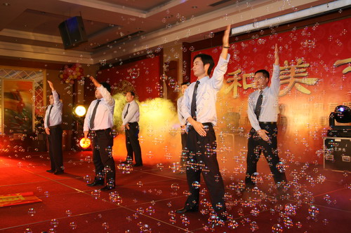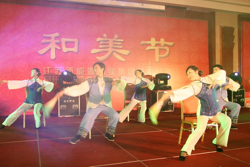 當(dāng)新能源集團公司的四位美女和兩位帥哥表演的舞蹈《青花瓷》作為開場節(jié)目表演時,董事長包廣林驚奇地問:這些演員難道是我們的員工嗎?;節(jié)目真是形式多樣,一個比一個精彩。表演戲曲串燒的男員工唱的是有板有眼,女員工唱的是韻味十足,令人回味無窮;音樂小品《工地情緣》更是新能源人將緊張的工作原汁原味地搬上舞臺,展現(xiàn)了新能源人越是堅難困苦,越發(fā)豪情滿懷的精神面貌。表演花鼓戲《劉??抽浴返膬晌粏T工熱情洋溢、十分投入;演唱《卓瑪》的劉總身著藏族服裝,將潔白的哈達獻給了現(xiàn)場的嘉賓。泰興分公司的《動感單車》給人們留下了深刻的印象,五位身穿運動服的員工騎著動感單車,時而左轉(zhuǎn),時而右轉(zhuǎn),時而爬坡,時而沖鋒,充分體現(xiàn)了我運動,我健康,我快樂;的新能源開發(fā)理念;表演時裝秀《廣陵古韻》的新能源虎豹公司八位美麗的姑娘身著盛裝,腳踏貓步,婀娜多姿,面帶微笑,在她們的伴隨和引領(lǐng)下,公司的老總們也集體閃亮登場時,全場響起了一片熱烈的掌聲。物業(yè)公司的女聲獨唱《誰不說俺家鄉(xiāng)好》和《風(fēng)含情水含笑》抒發(fā)了新能源人對家鄉(xiāng)的熱愛之情,武術(shù)表演則用男性特有的陽剛之氣表達了新能源物業(yè)人為業(yè)主保衛(wèi)家園的勇氣和本領(lǐng)。充滿青春活力的舞蹈《青春勁舞》和表現(xiàn)異國情調(diào)的爵士舞熱情奔放,小合唱《北京歡迎你》和燭光舞《平安夜》親切甜美,使人賞心悅目。如果說男生群舞《開心寶》讓人的神經(jīng)高度興奮,使人開懷大笑的話,男女對唱《美麗的神話》則充分表達了新城市花園樓盤在泰興獨領(lǐng)風(fēng)騷的原因,那就是新能源堅定不移地走品牌之路,創(chuàng)精品工程的結(jié)果。