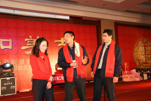 錦繡天邊掛,彩虹肩上披,引來吉祥鳥,寒冬報春暉。;新能源虎豹公司顧載兵總裁宣讀的頒獎辭不僅是對時裝秀的最好詮釋,而且是對新能源人迎接挑戰(zhàn),戰(zhàn)勝嚴冬心愿的最好表達。最后時裝秀、《開心寶》、《卓瑪》、武術(shù)表演等四個節(jié)目分別獲得最佳風(fēng)韻獎、最開心獎、最甜美歌聲獎和最佳功夫獎。 和美節(jié);為10家優(yōu)秀施工單位及供貨商代表頒了獎,還進行了幸運抽獎活動。2個小時的晚會始終洋溢著團結(jié)、祥和、熱烈、歡樂的氣氛。