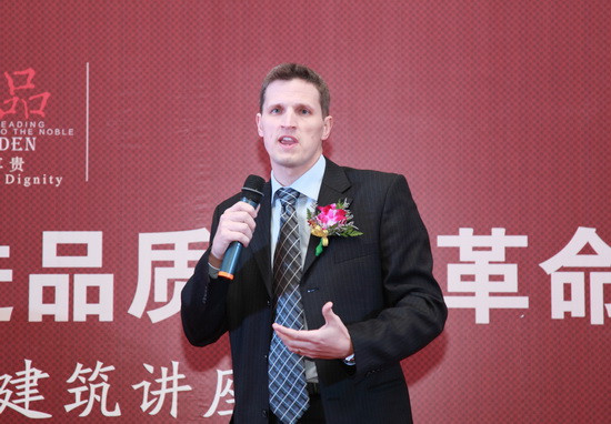 加拿大駐上海總領(lǐng)事館領(lǐng)事兼商務專員司馬天明先生首先致詞,他從全球氣候的變化闡述了開發(fā)木結(jié)構(gòu)住宅的戰(zhàn)略意義。加拿大木業(yè)協(xié)會中國區(qū)總裁史瑞德先生全面介紹了加拿大木結(jié)構(gòu)建筑在中國的發(fā)展前景。加拿大木業(yè)協(xié)會市場傳訊總監(jiān)Dave先生作了木結(jié)構(gòu)建筑的主旨演講,他首先介紹了木結(jié)構(gòu)建筑的概況,現(xiàn)代輕型木結(jié)構(gòu)和中國傳統(tǒng)木結(jié)構(gòu)的區(qū)別,然后著重講解了木結(jié)構(gòu)在防震抗震、防水防蛀、保溫保濕、優(yōu)質(zhì)低碳、造型美觀等方面具有的鮮明特色。他特別強調(diào),名門壹品木結(jié)構(gòu)建筑作為加拿大木業(yè)協(xié)會和新能源;合作成功的典范,在中國成為樣板。