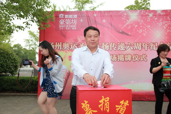 5月26日是北京奧運(yùn)圣火在揚(yáng)傳遞六周年紀(jì)念日。5月25日上午,中國(guó)火炬手聯(lián)合會(huì)執(zhí)行主席、中國(guó)奧運(yùn)火炬手協(xié)會(huì)理事長(zhǎng)黃海軍等領(lǐng)導(dǎo)專程從北京來?yè)P(yáng),與揚(yáng)州部分奧運(yùn)火炬手聚會(huì),并為坐落在新能源豪第坊的火炬廣場(chǎng)揭牌。在活動(dòng)現(xiàn)場(chǎng),部分火炬手還當(dāng)場(chǎng)捐款,為火炬廣場(chǎng)體育設(shè)施建設(shè)添一把柴。為助力北京申辦2022年冬奧會(huì),火炬手們還在條幅上簽名,表達(dá)揚(yáng)州火炬手的心聲。
