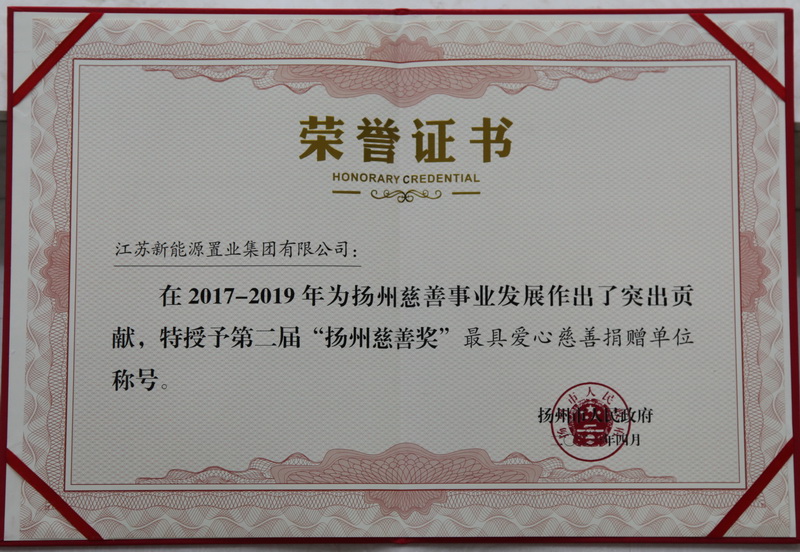 江蘇新能源置業(yè)集團(tuán)自1996年成立以來,一直把慈善文化列為企業(yè)文化的重要組成部分,先后在揚(yáng)州市慈善總會(huì)、儀征市慈善總會(huì)建立了“新能源慈善教育基金”;在邗江中學(xué)和邗江實(shí)驗(yàn)學(xué)校設(shè)立了“新能源獎(jiǎng)學(xué)金”和“新能源貧困生助學(xué)金”;每年向揚(yáng)州市慈善總會(huì)捐贈(zèng)一定數(shù)額的專項(xiàng)基金,用于救助全市弱勢(shì)群體;每年組織全體員工集中參與“5·19慈善一日捐”;以每個(gè)干部員工個(gè)人名義在揚(yáng)州市慈善總會(huì)建立了我市首個(gè)“個(gè)人冠名基金”。20多年來,“新能源”向社會(huì)各界捐贈(zèng)的錢物總量已達(dá)3000多萬元,幫扶人次近3000人。