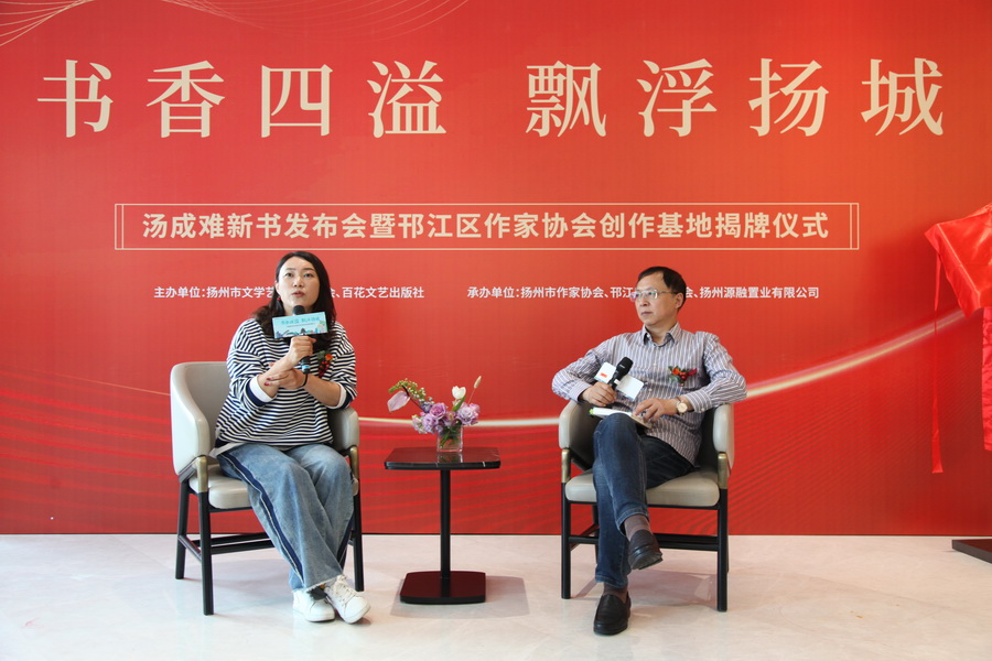 5月14日上午,揚(yáng)州著名作家湯成難在新能源·書(shū)香一品營(yíng)銷(xiāo)中心舉行新書(shū)《飄浮于萬(wàn)有引力中的房屋》的首發(fā)式,,同時(shí)還舉行了邗江區(qū)作家協(xié)會(huì)創(chuàng)作基地揭牌儀式。