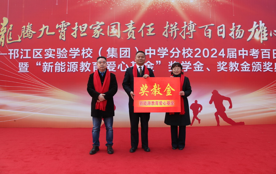 ‘新能源’在發(fā)展的同時(shí),一直將支持教育、參與社會(huì)公益作為企業(yè)文化的重要組成部分,做到取之于社會(huì),回饋于社會(huì)。今天的獎(jiǎng)學(xué)金、獎(jiǎng)教金共96000元,凝聚著‘新能源’全體員工的一片愛心,將激勵(lì)同學(xué)們努力拼搏,奮發(fā)向上,拿出愚公移山的志氣和滴水穿石的毅力,腳踏實(shí)地、埋頭苦干,在這次中考中取得佳績。”