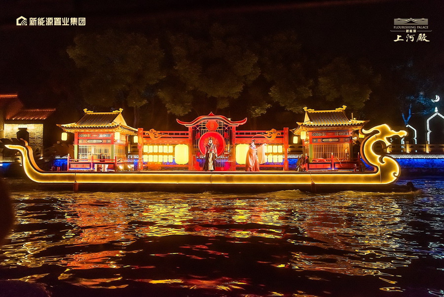 盛世上河之殿,龍船榮耀啟航。隨著龍船的緩緩前行,從古運(yùn)河的槳聲燈影里,多個(gè)精彩篇章亮相于眼前,讓現(xiàn)場(chǎng)賓客仿佛置身于古代繁華的揚(yáng)州城,光影層疊交織,重現(xiàn)商賈云集、文人雅集的運(yùn)河盛景。伴隨著前行的潺潺水聲,不絕于耳的贊美聲、驚嘆聲在夜空中回蕩。